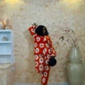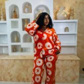 Step into confidence with the Ire Set (Orange), a vibrant Adire two-piece outfit featuring a chic button-down shirt and long trousers.