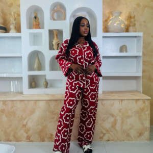 Step into confidence with the Ire Set (Orange), a vibrant Adire two-piece outfit featuring a chic button-down shirt and long trousers.